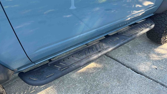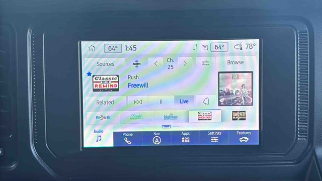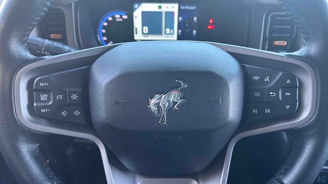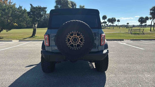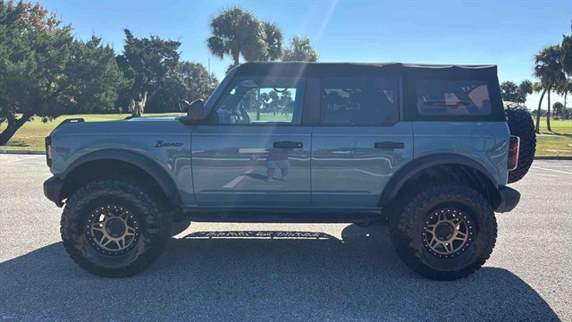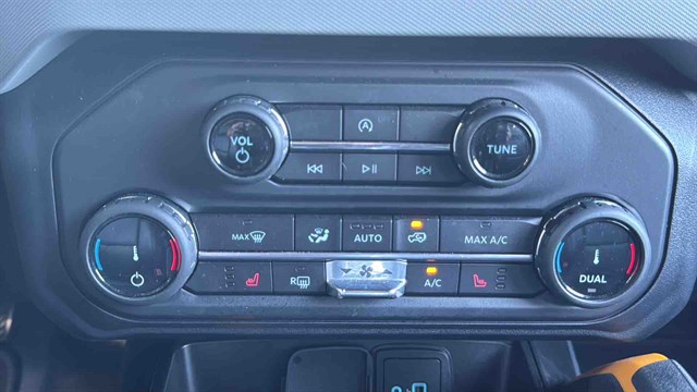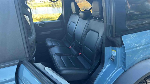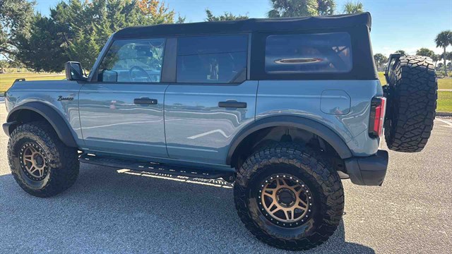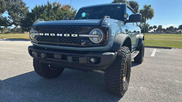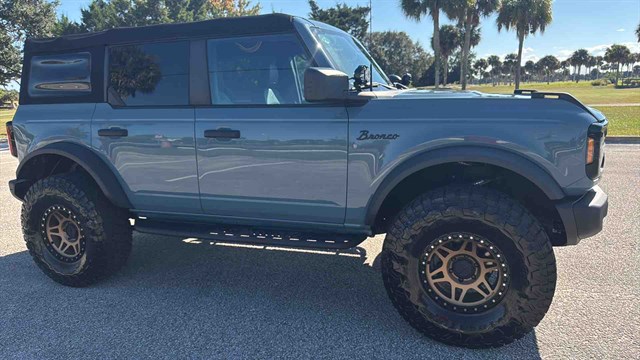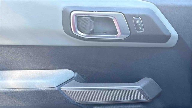 The Badlands Package is highlighted by Marine-Grade Vinly Seats, Upgraded LED headlights, Unique Badlands suspension, Front stabilizer bar disconnect (allows for improved wheel articulation for off-road driving), Heavy-duty front and rear bumpers, Skid plates, Black grille, Rock rails (prevent body damage while off-roading), Prewired auxiliary switches, Rubber flooring, Seven-mode terrain management system, LED headlights, Soft top, Digital instrument panel, Push-button start, Six-way manually adjustable front seats, Power windows, 8-inch infotainment touchscreen, Six-speaker audio system, Satellite radio, Apple CarPlay/ Android Auto smartphone integration (with wireless connectivity), Wi-Fi hotspot, Hill start assist (momentarily holds the brakes to keep the Bronco from rolling backward at a stop), Automatic emergency braking (warns if a front impact is imminent and applies the brakes if you don't respond in time), Hill descent control (keeps the Bronco at a constant speed while descending steep slopes), and Trailer sway damping (adjusts vehicle brakes to help control trailer movement if a trailer begins to sway).